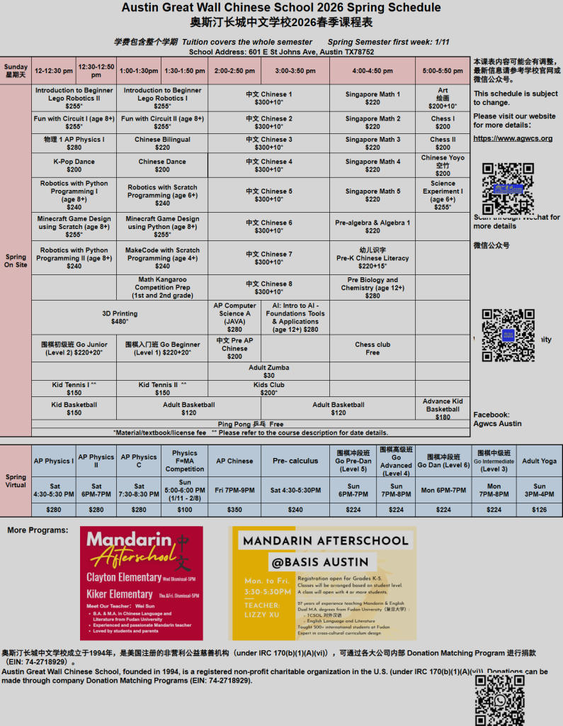Austin Great Wall Chinese School is the biggest Chinese school in the central Texas area. AGWCS offers regular Chinese (pre-K to AP), Math (K to 5) and other classes for both children and adults such as STEM, Art, Marshall Art, Chess, Badminton, Basketball, Yoga, and Zumba. See “Courses” on the left panel for details.