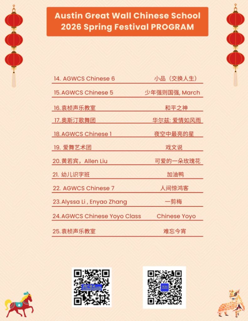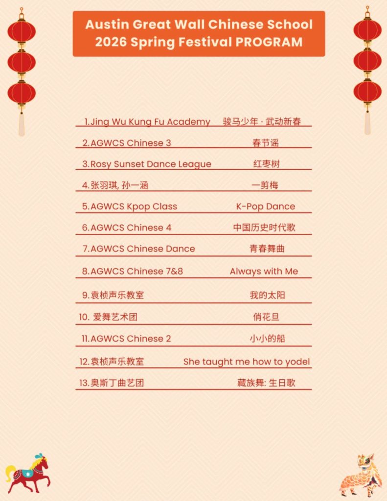 奥斯汀长城中文学校是德州中部地区最大的中文学校。学校常年提供各个年级的中文课程(pre-K to AP),和各种适合大人孩子的各种课程,例如新加坡数学,STEM,绘画,武术,象棋,羽毛球,篮球,瑜伽,尊巴舞。详情请看课程简介。
